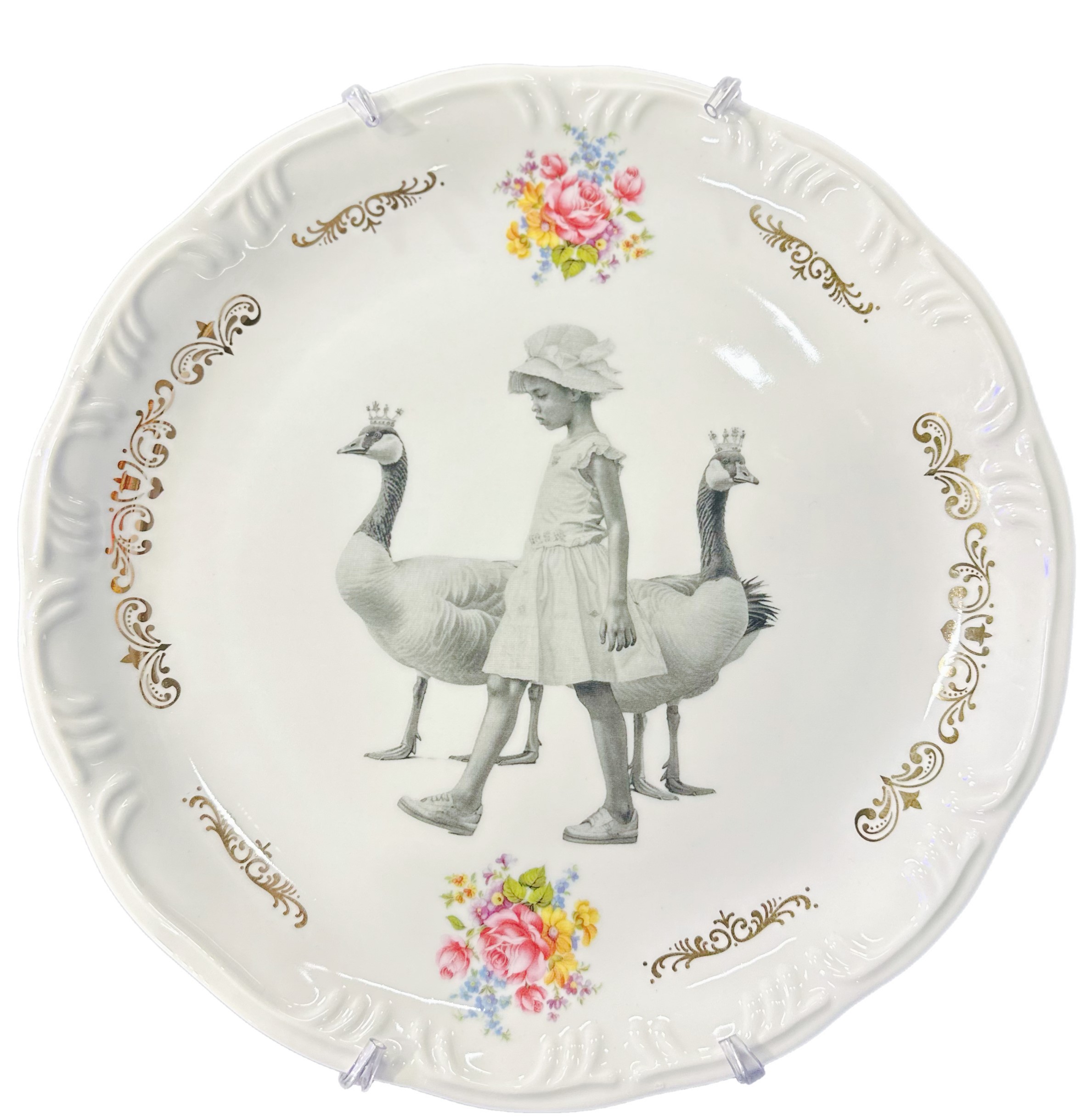 Prato de porcelana com menina E gansos Com floral rosa e detalhes em ouro
