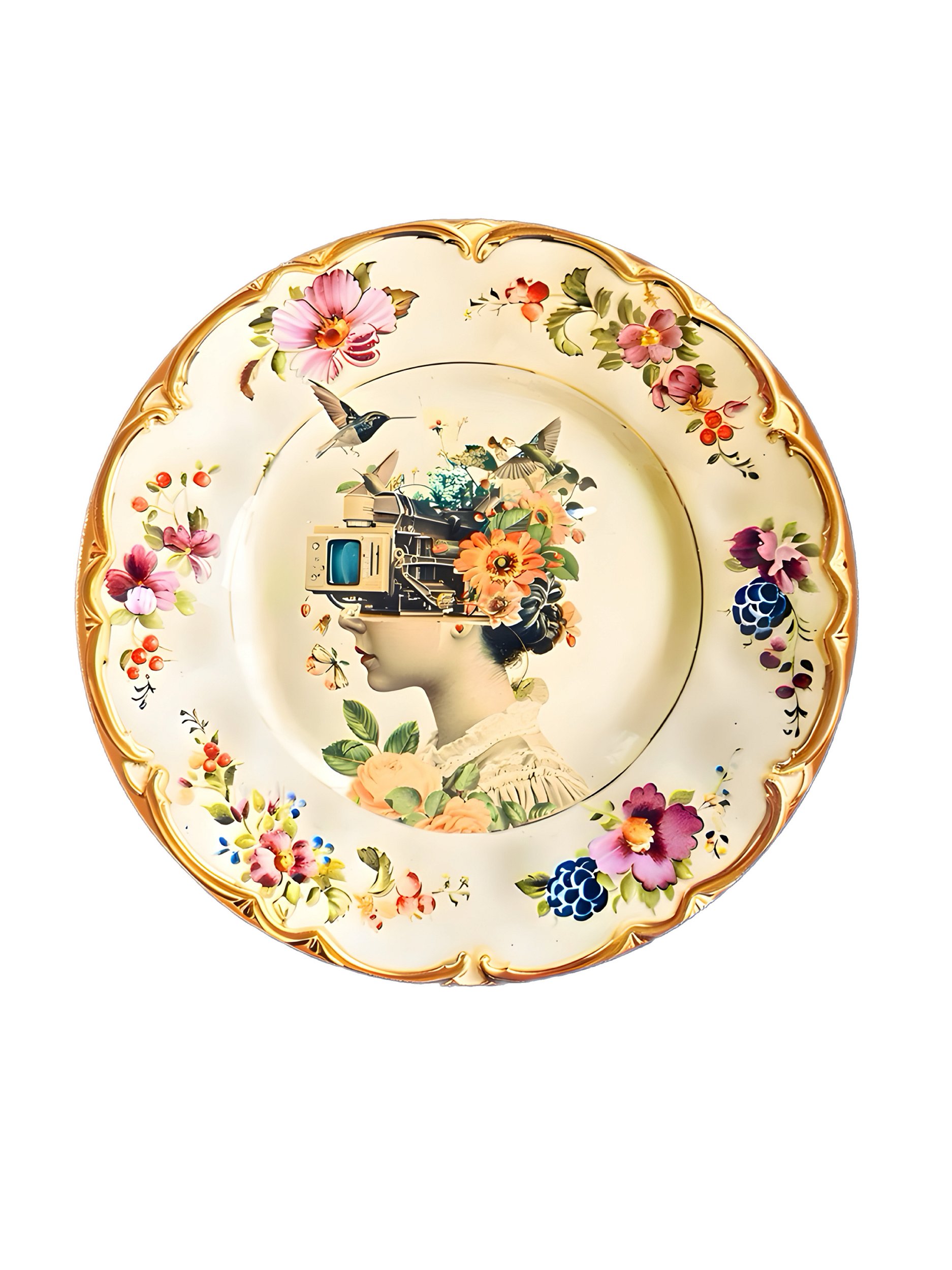 Azulejo ceramico medindo 19cm com imagem de prato antigo e colagem Menina Maquina.