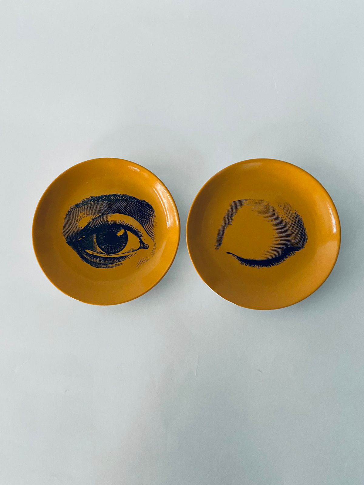Cj. de 2 pratos de porcelana 10cm na cor Ocre com ilustração olhos