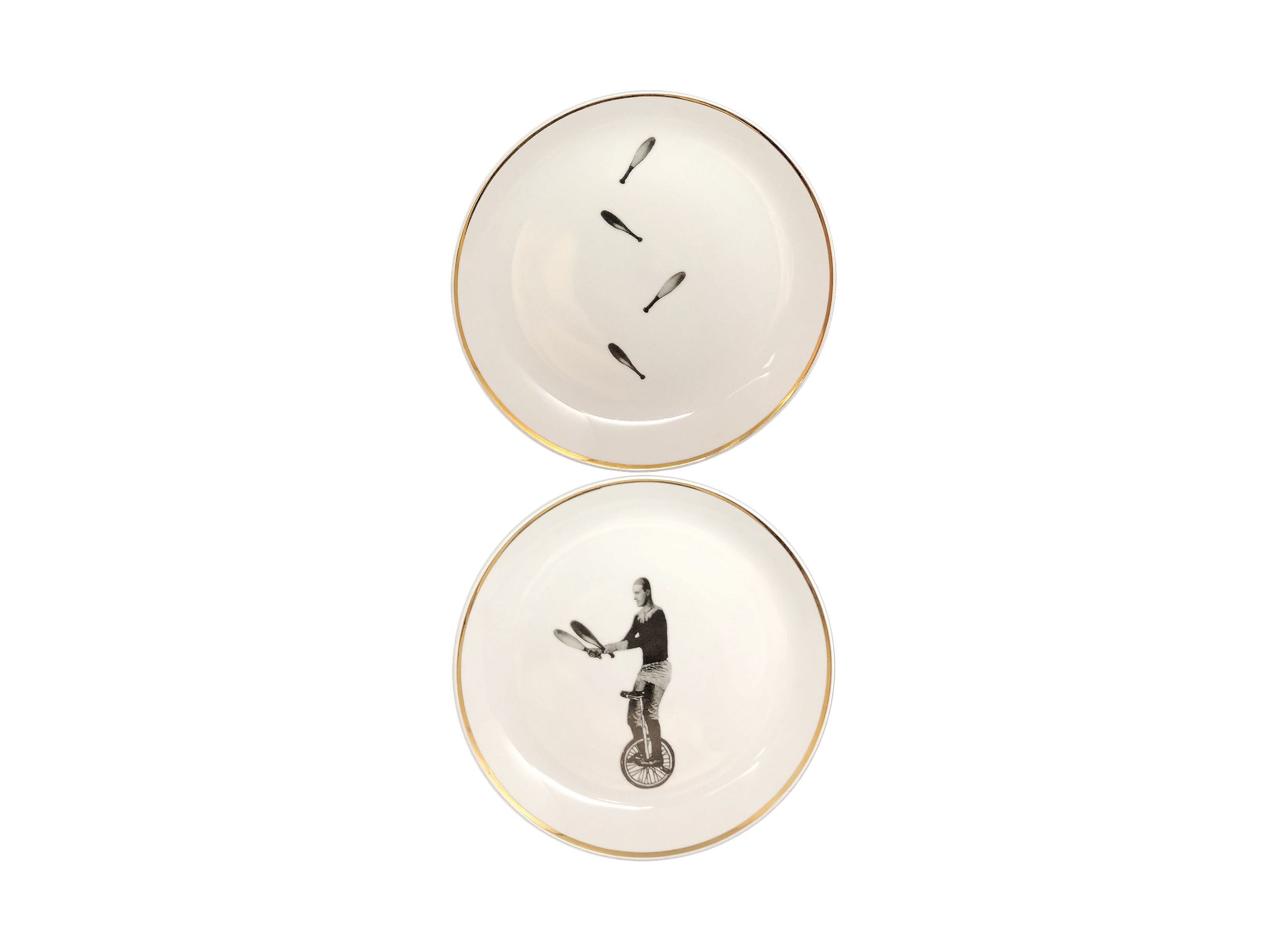 Conjunto de 2 pratos Malabarista com filete dourado.