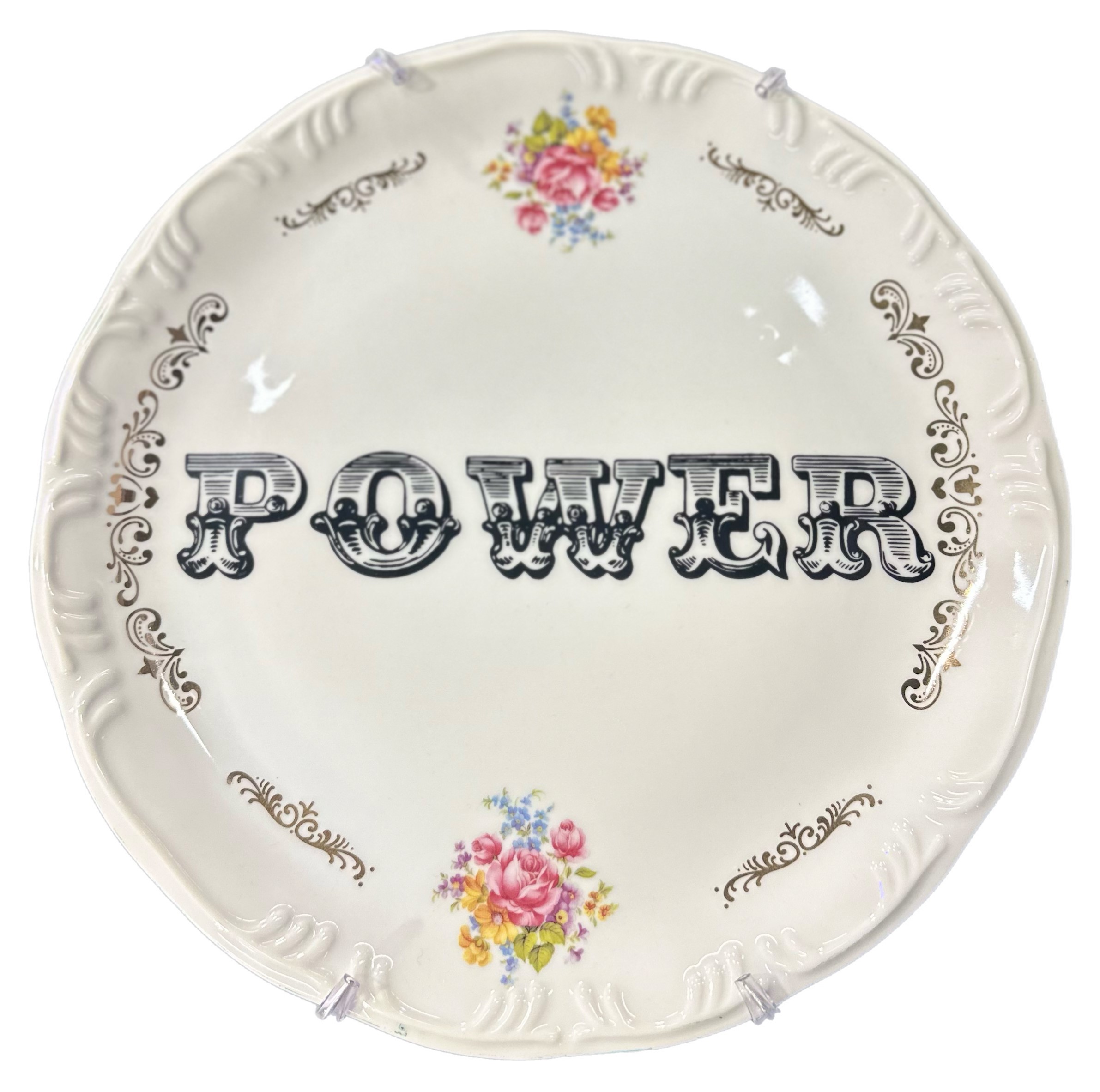 Prato de porcelana com a Escrita Power Com floral rosa e detalhes em ouro