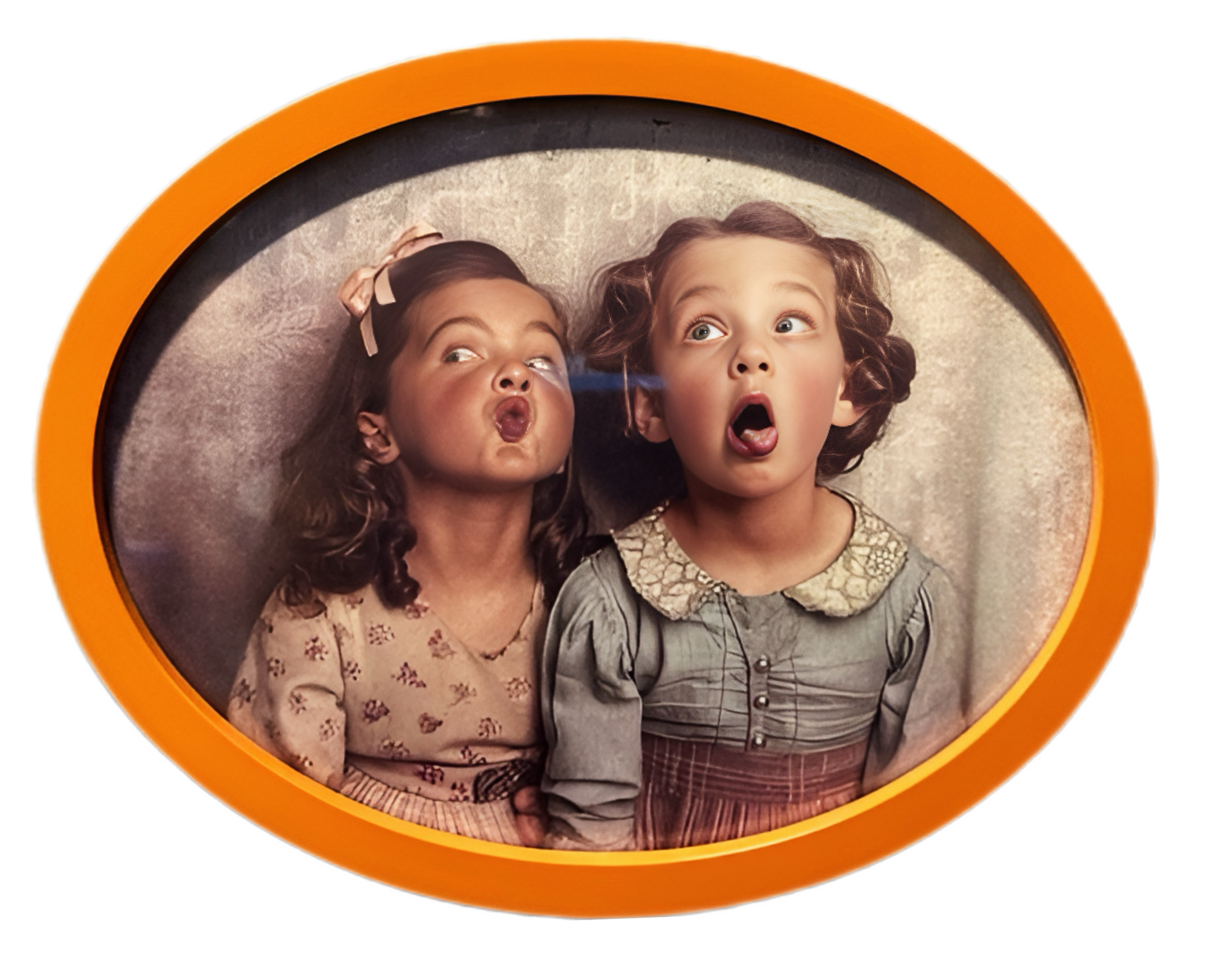 Gravura "Meninas Língua" impressa em papel Markatto de 420grs, com moldura oval em madeira na cor marrom.