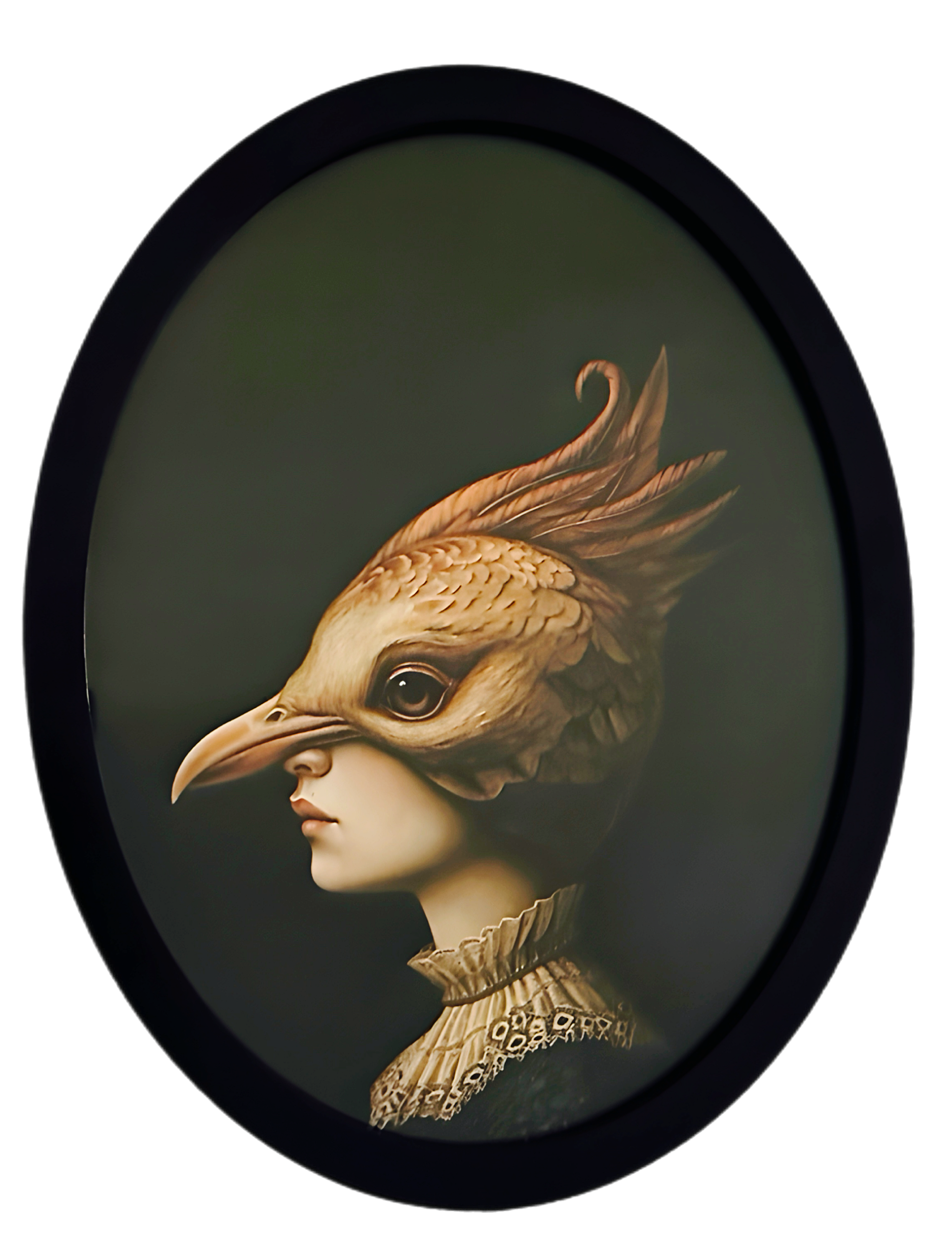 Gravura "Mulher Águia " impressa em papel Markatto de 420grs, com moldura oval em madeira na cor preta e vidro para proteção
