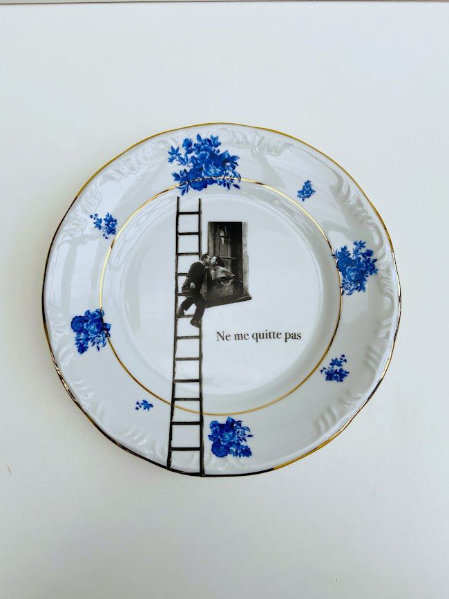 Prato Vintage Ne me quitte pas. com friso dourado 27 cm de diâmetro. Acompanha gancho.