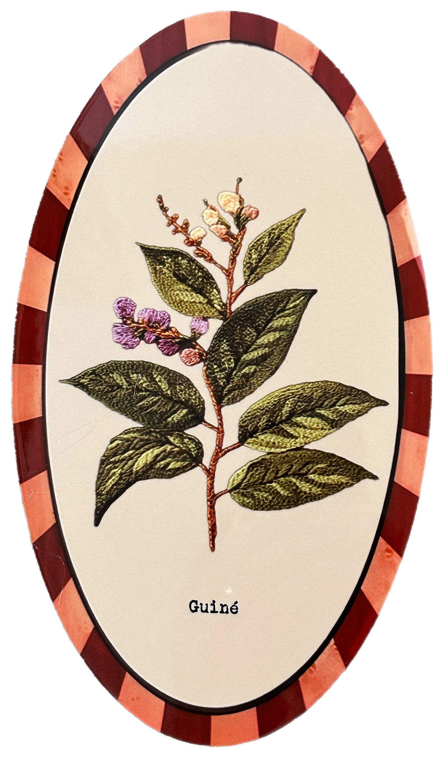 Azulejo oval com ilustração de uma galho de Guine com moldura estampada , um dos 7 azulejos criados para a colecao 7 Ervas